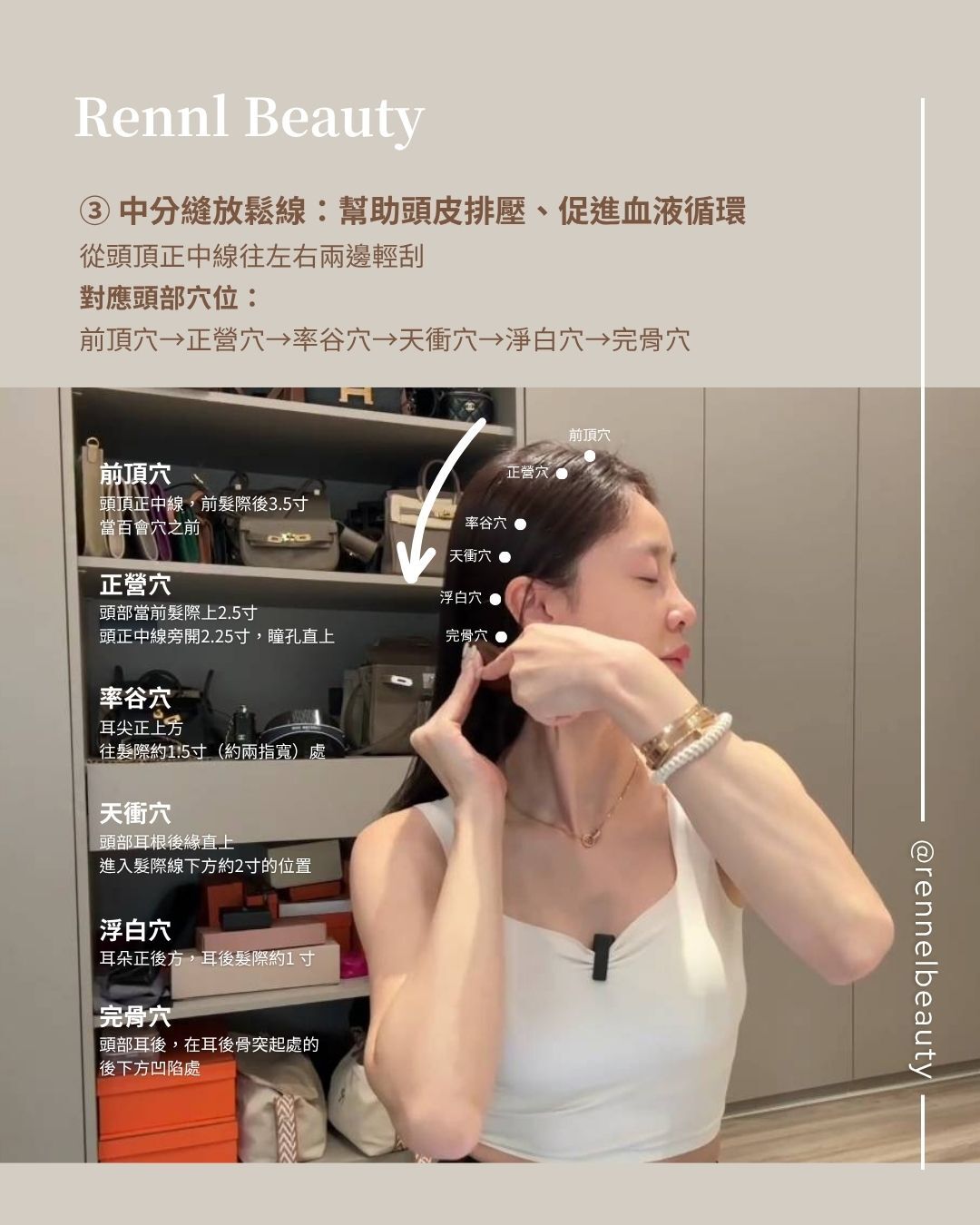 髮際線中央 → 頭頂 → 後腦,畫大圈