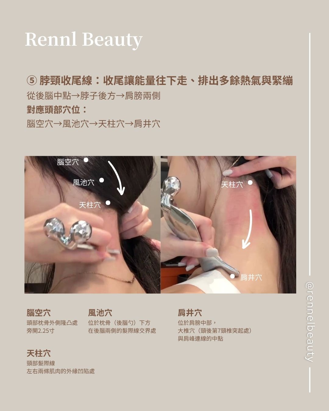 眉毛上方髮際線 → 太陽穴 → 耳後 → 脖頸