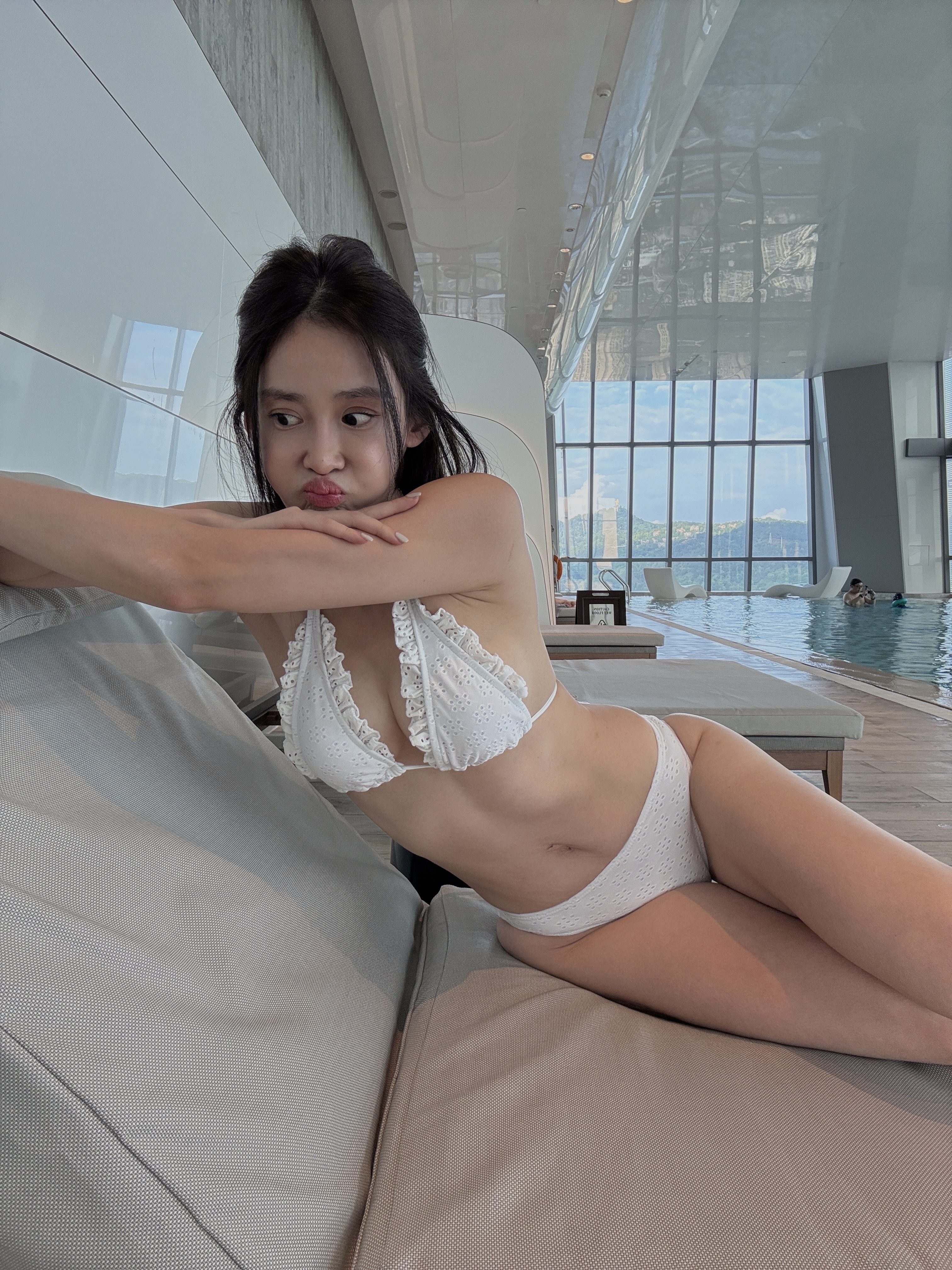 以浪漫法式緹花布料打造的三件式比基尼套裝