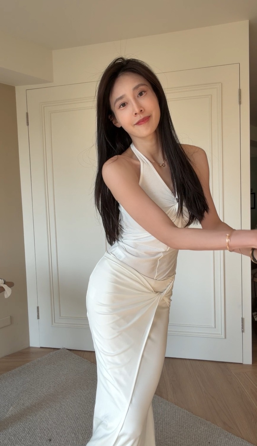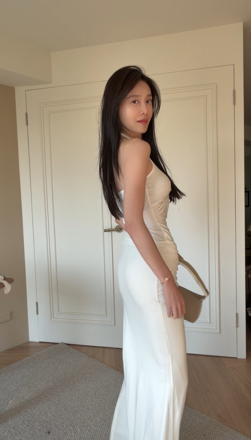 下身搭配高腰魚尾長裙