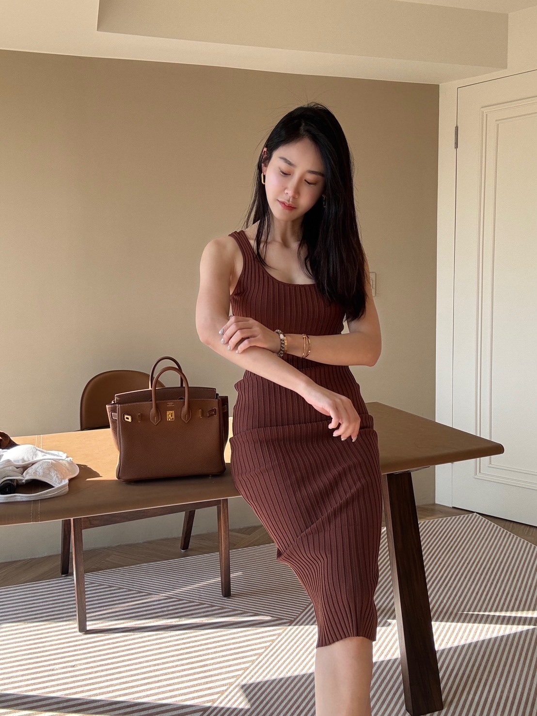 這款 修身羅紋針織長洋裝 以 貼合身形的剪裁 展現 優雅曲線,完美突顯身材比例。