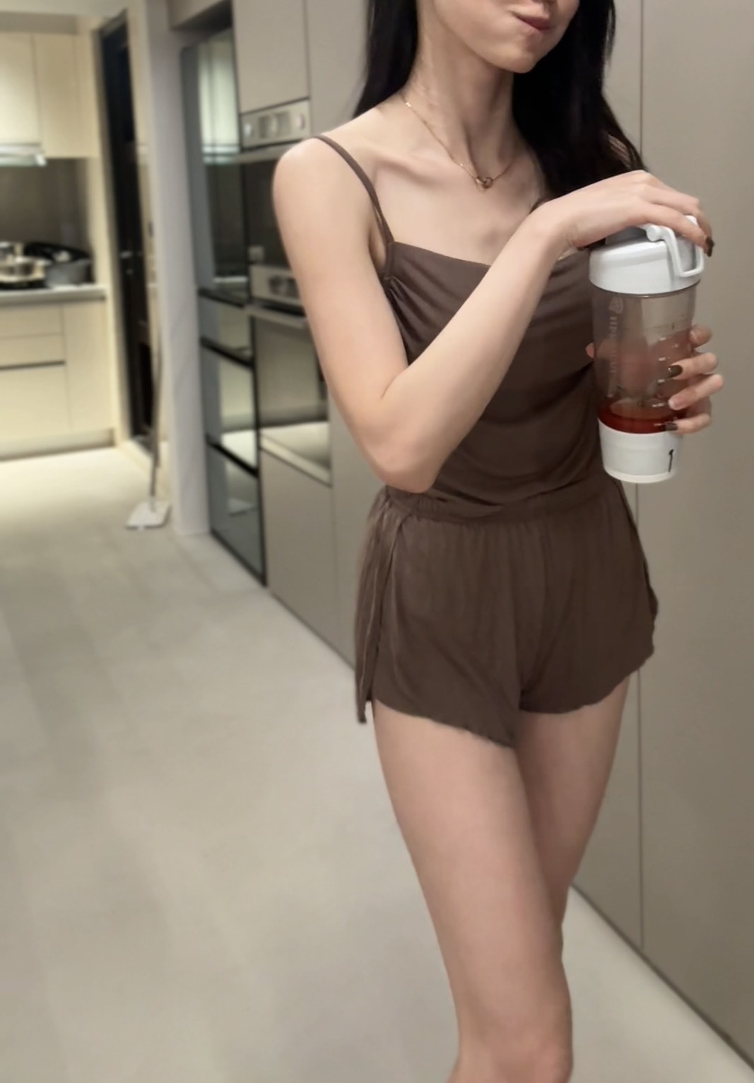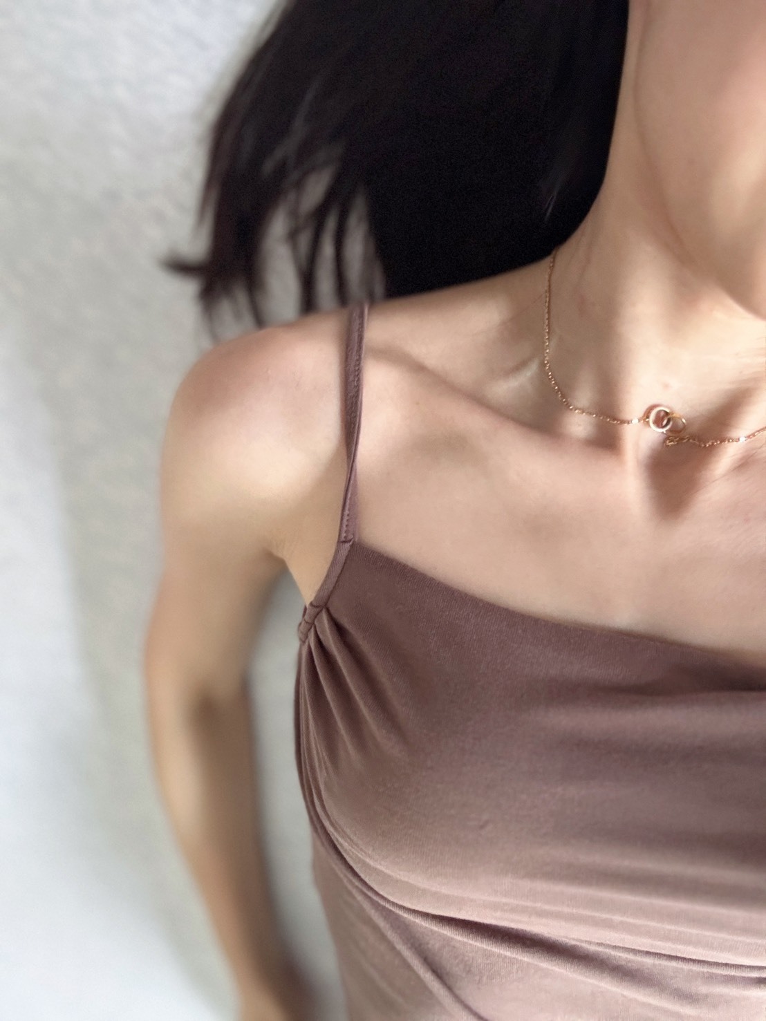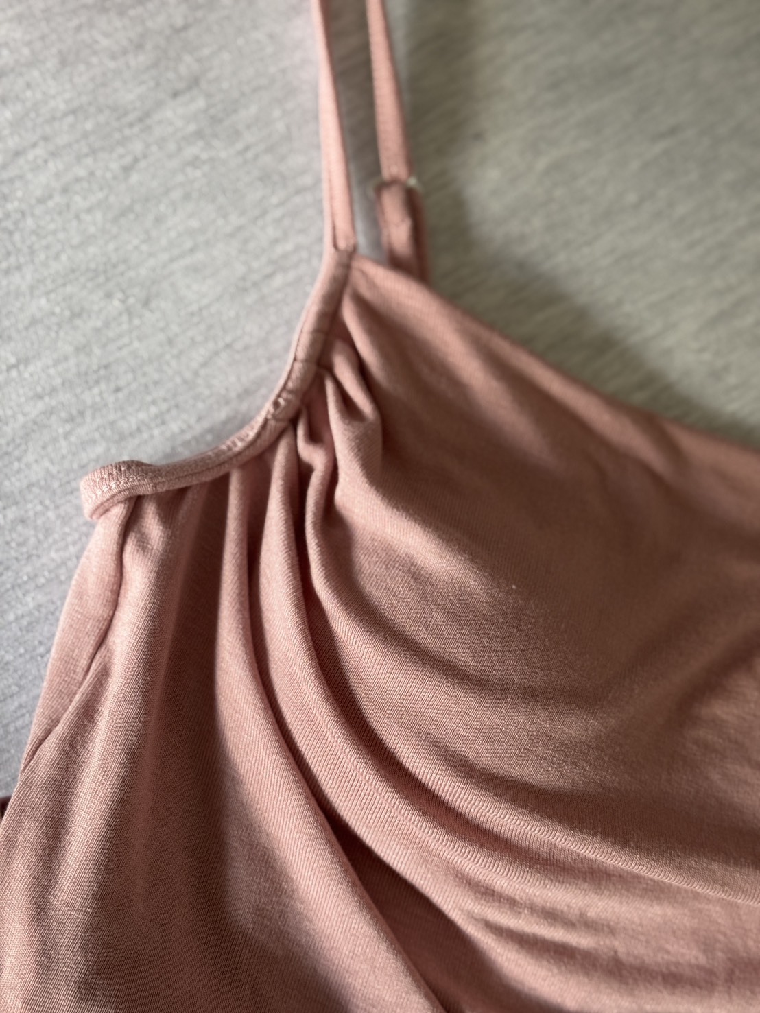 上衣為簡約垂墜領設計,搭配可調式細肩帶,貼合身形且修飾肩頸線條