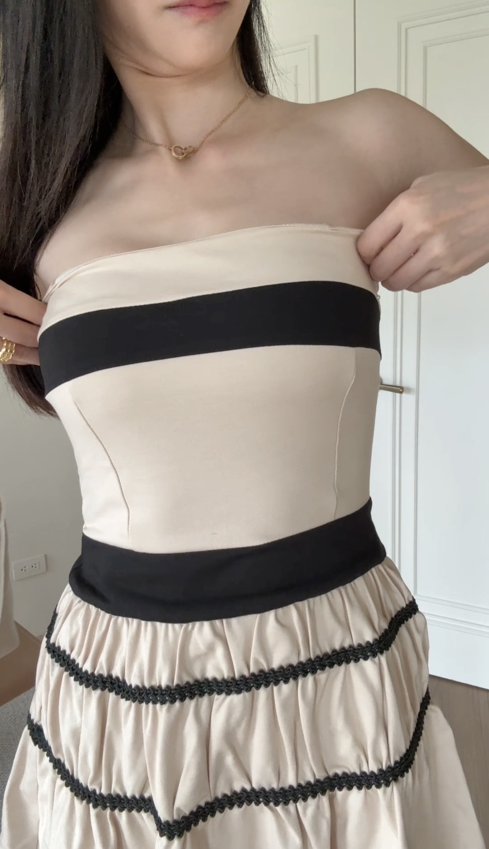 以極簡平口剪裁搭配多層蛋糕裙擺