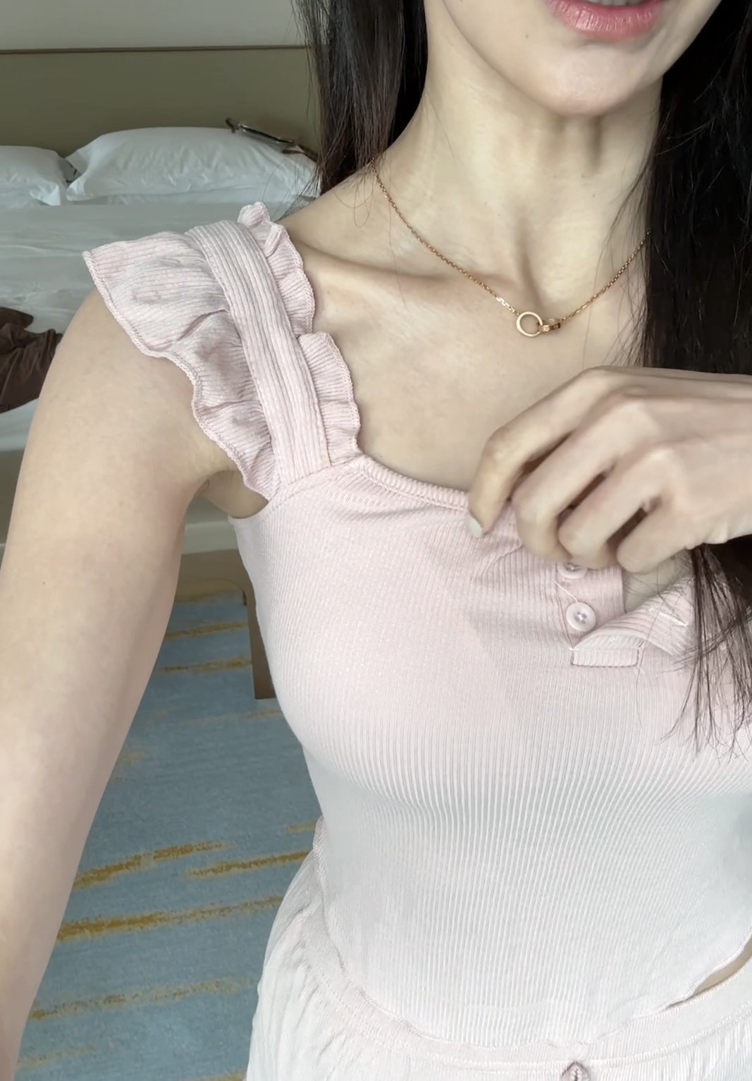 荷葉寬肩帶背心搭配鬆緊綁帶短褲,穿起來清爽不悶