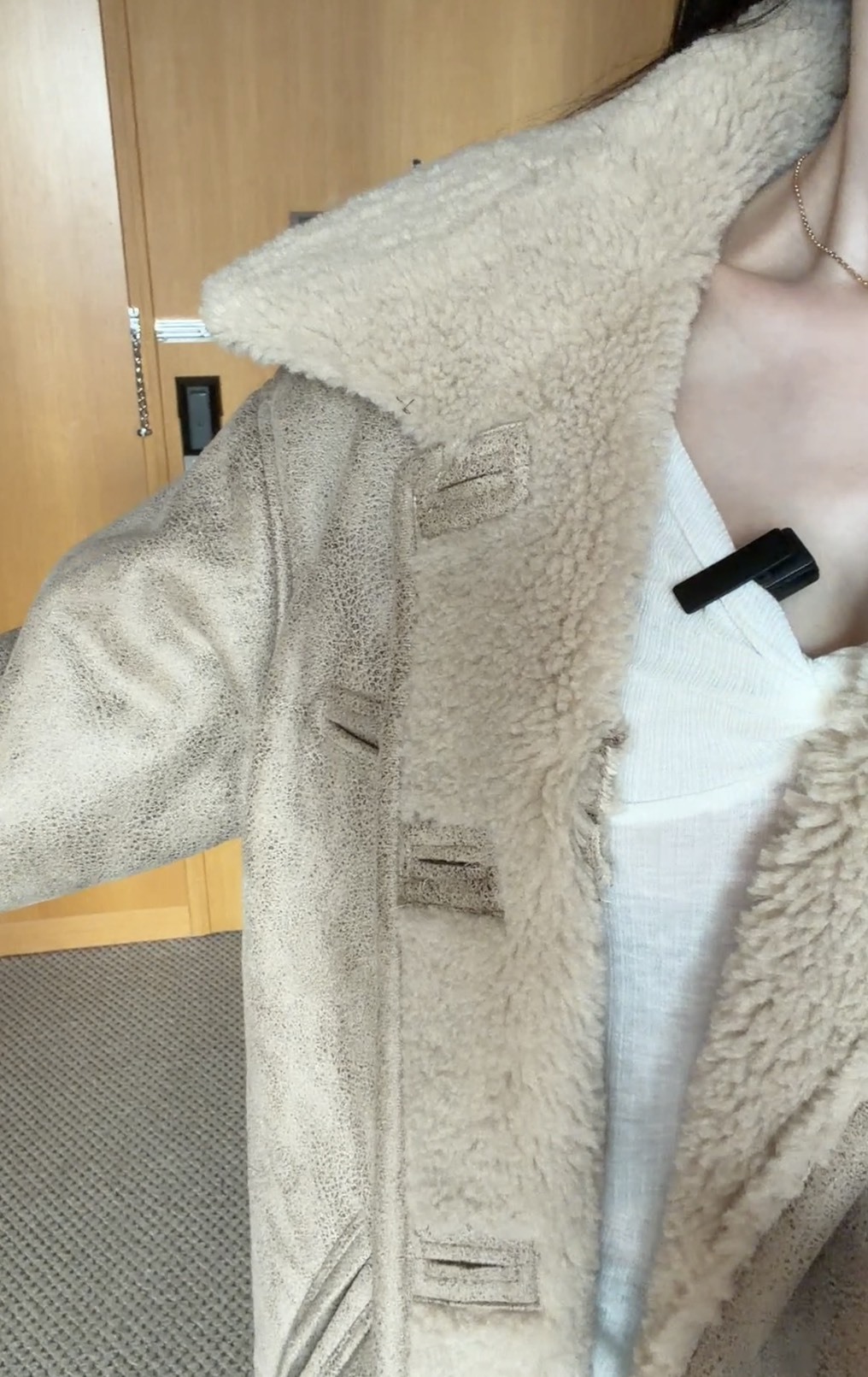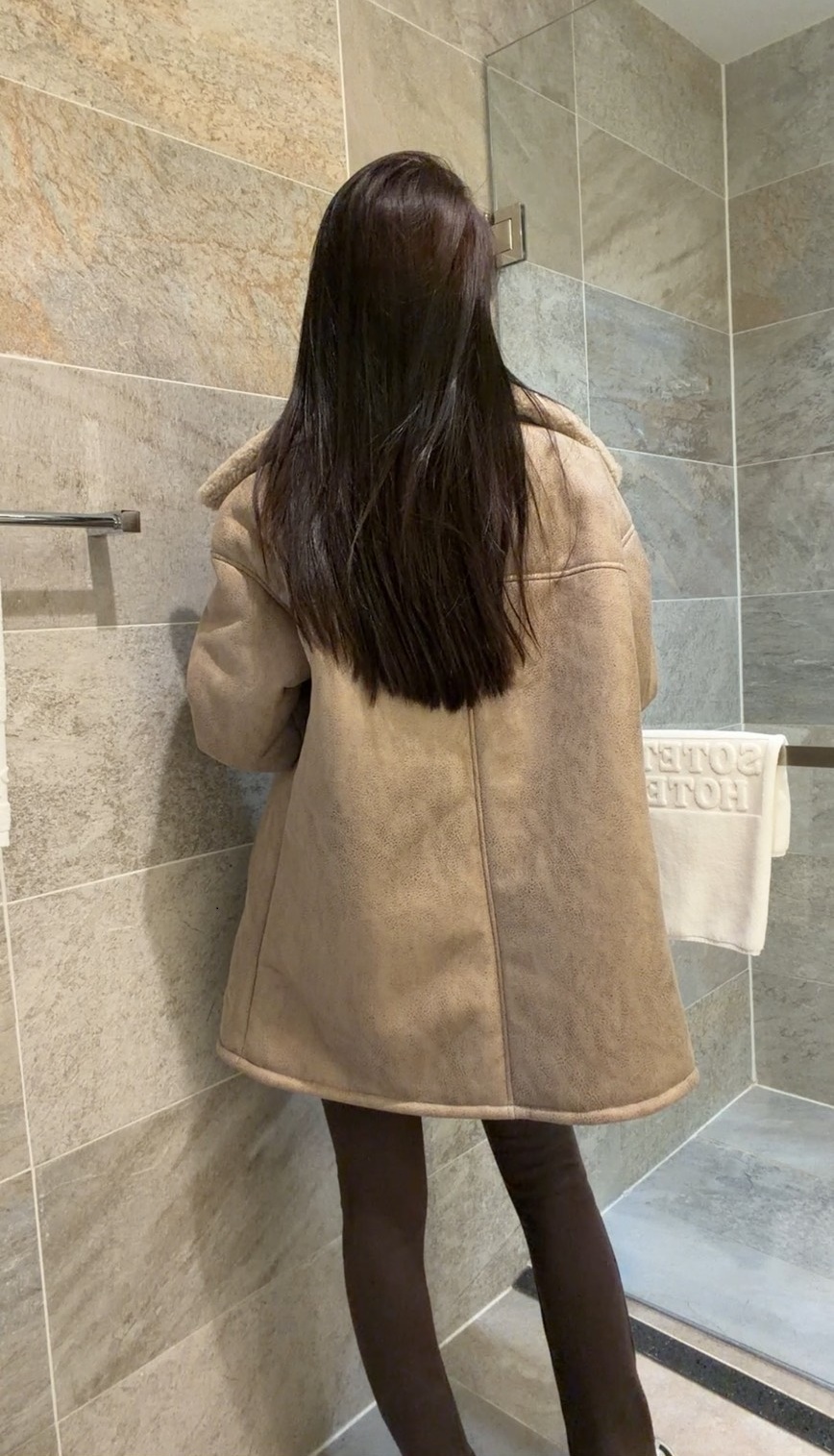 外層為霧面麂皮質感布料,內裡鋪滿柔軟泰迪絨