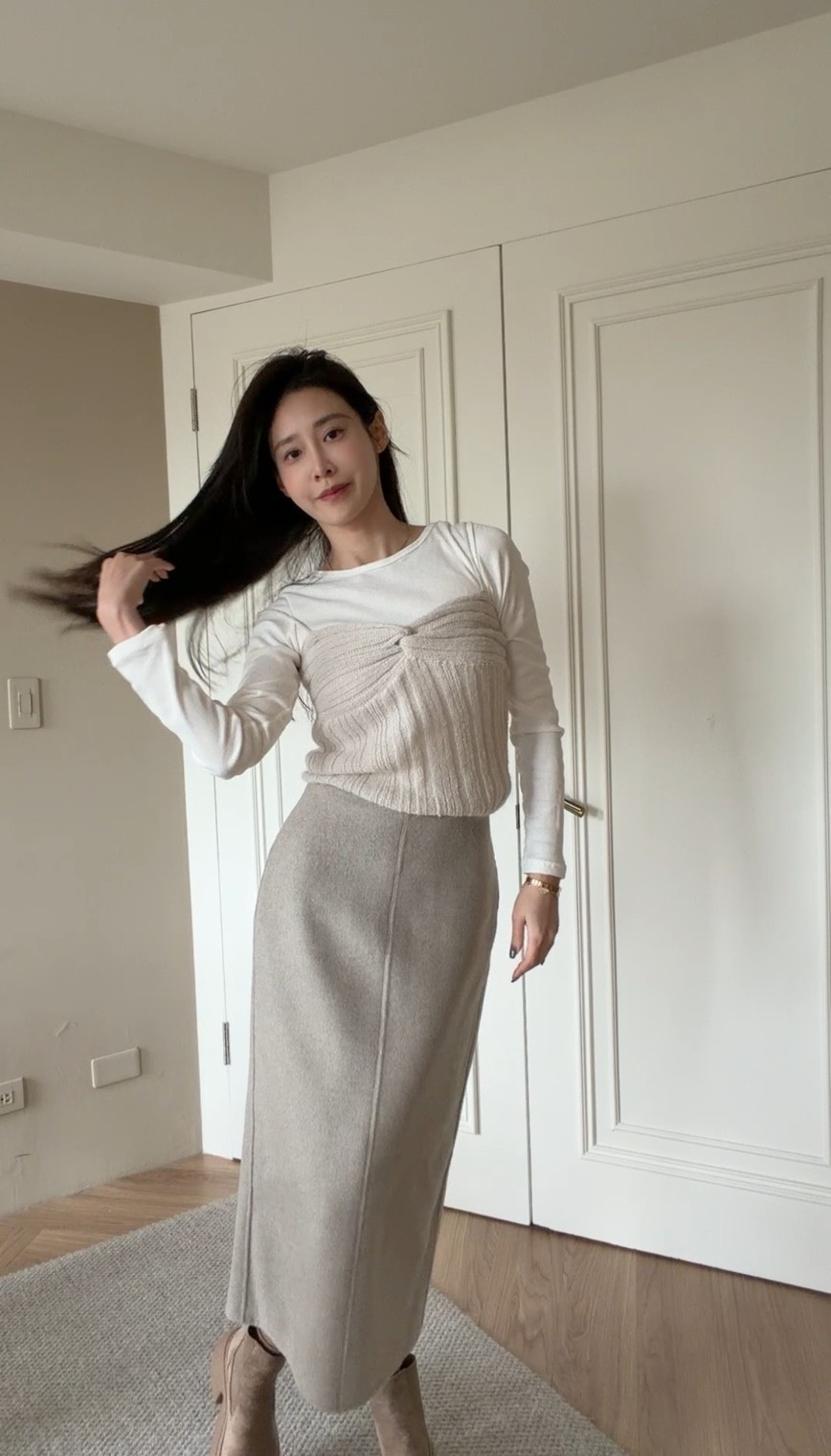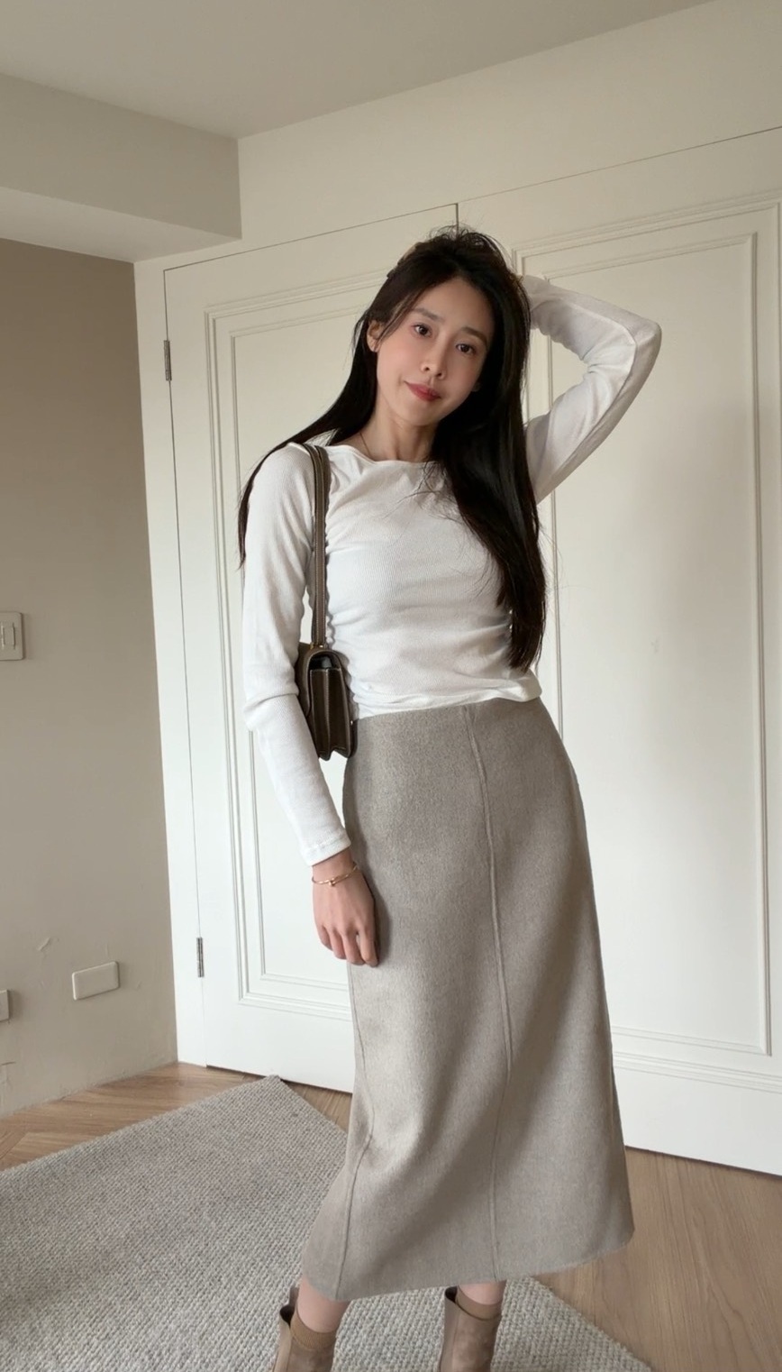 這款 羊絨 A 字長裙 採用細緻羊絨混紡面料