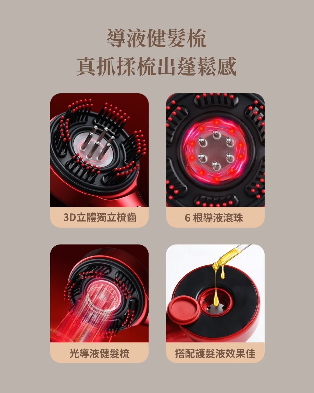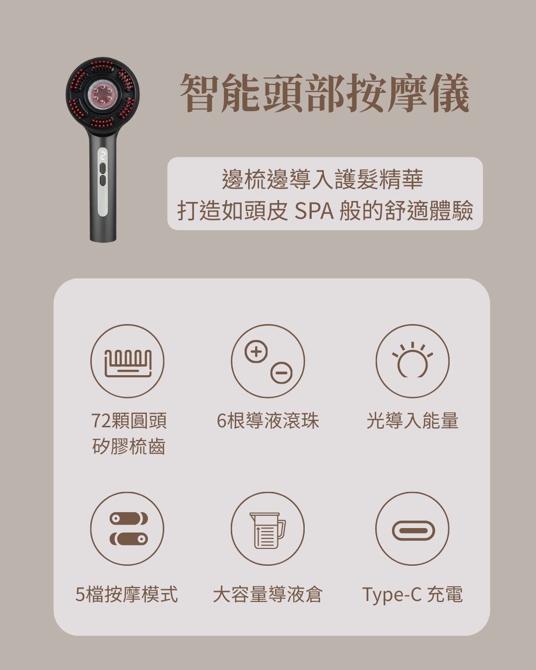 三重養護:72 顆圓頭矽膠梳齒 + 6 根導液滾珠,一梳多效。