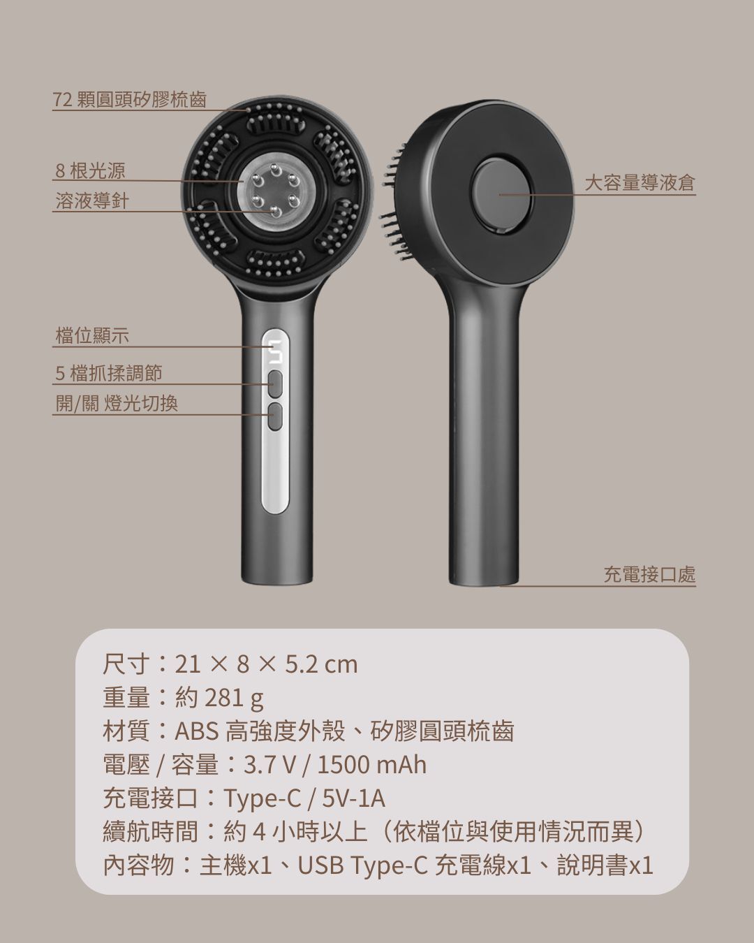 材質:ABS 外殼、矽膠圓頭梳齒