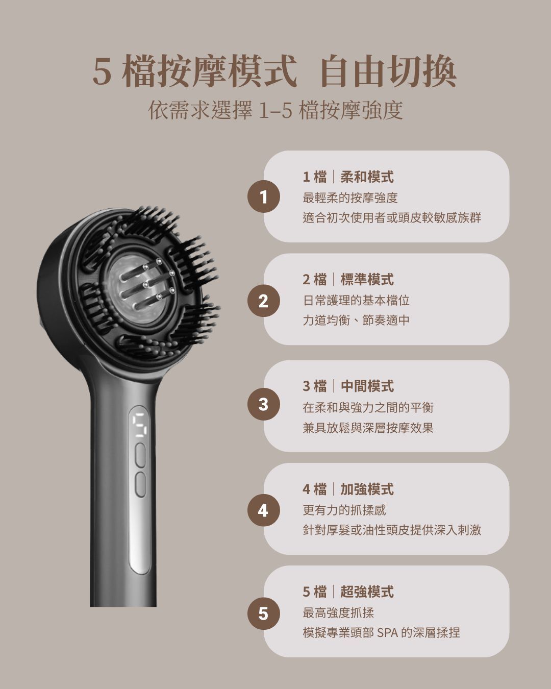 貼心提醒:初次使用建議從 1 檔開始,依個人舒適度逐步調整,避免長時間於最高檔位連續使用,以維持頭皮健康與舒適。